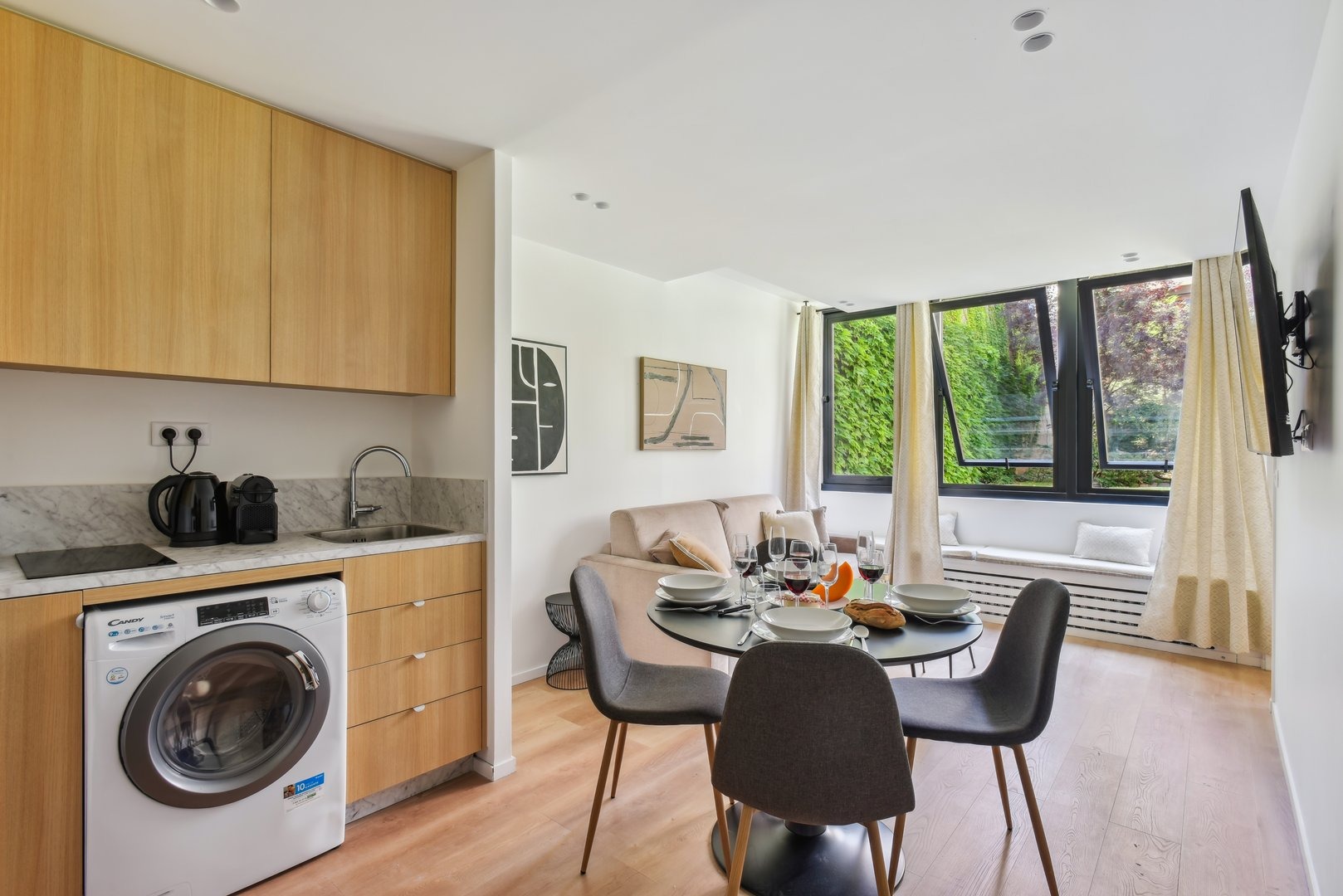 Enjoy a pleasant stay in this well-decorated apartment equipped to meet all your needs: Living room: A comfortable space with a double sofa bed, TV screen and modern decor for relaxing moments after your explorations. Kitchen: An open-plan kitchen, equipped with hob, microwave and Nespresso machine. Bedroom: A bedroom with a comfortable double bed and quality bed linen. Bathroom: A modern bathroom with all the necessary amenities. Toilet: A toilet separate from the bathroom for added convenience. Additional amenities: Washing machine, iron, Wi-Fi included, bed linen and towels provided for each guest. Additional information: The apartment is located on the ground floor of a building without an elevator. Access to the apartment requires going up and down stairs.