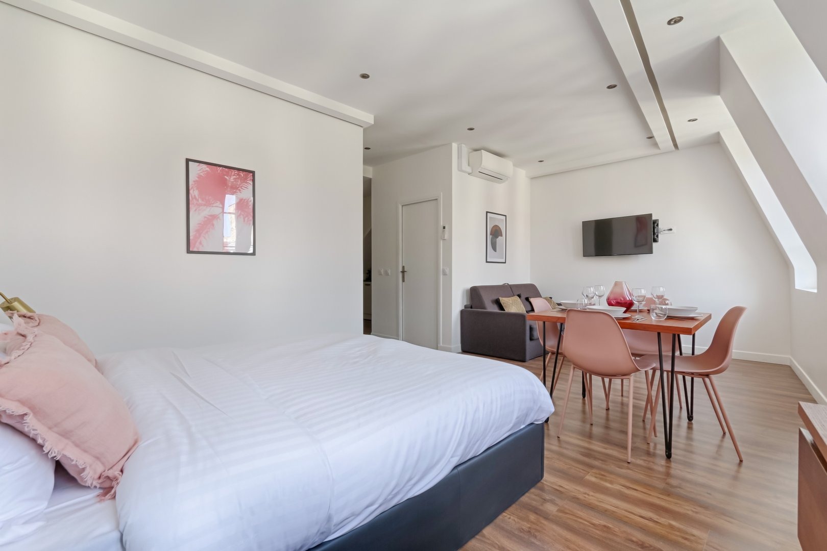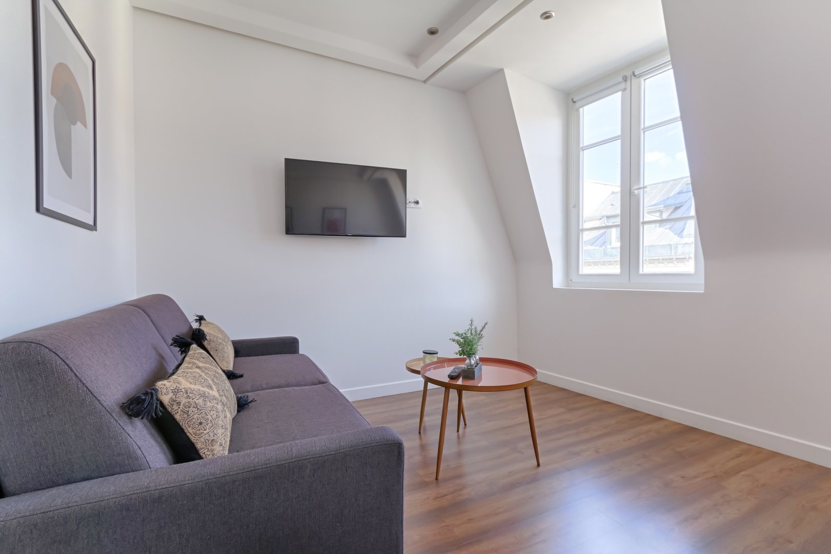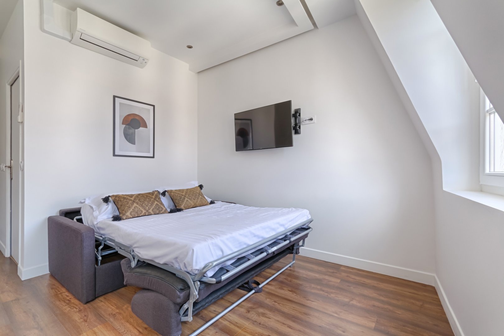 Enjoy a comfortable stay in this furnished studio, designed to offer you a pleasant, functional and relaxing setting in a lively district of the capital: Living room: A warm, well-thought-out space, equipped with a double sofa bed, a double bed, a pretty flat-screen TV, a colorful coffee table and a convivial dining table, perfect for meals or moments of relaxation in a cosy atmosphere. Kitchen: A small, functional, fully-equipped kitchen with hob, microwave, small fridge and Nespresso machine. Coffee capsules, sugar and tea are also available to enhance your gourmet moments. Bathroom: A modern, well-appointed bathroom with shower, mirror, hairdryer and welcome kit with shower gel and shampoo. Everything has been designed to meet your daily needs with simplicity and comfort. Toilet: One toilet in the bathroom. Additional amenities: The studio also features an iron, an air conditioning, Wi-Fi connection included, and sheets and towels prepared for each guest. Everything is designed to make you feel immediately at home. Additional information: The apartment is located on the 5th floor of a secure building without elevator, in a lively Parisian neighborhood appreciated for its restaurants, local ambiance and nightlife. Rue Saint-Denis, where the apartment is located, was once a hotbed of Parisian prostitution. There are still a few prostitutes in the area, and you may notice vestiges of this history. Today, the area is best known for its lively atmosphere, while remaining a safe neighborhood.